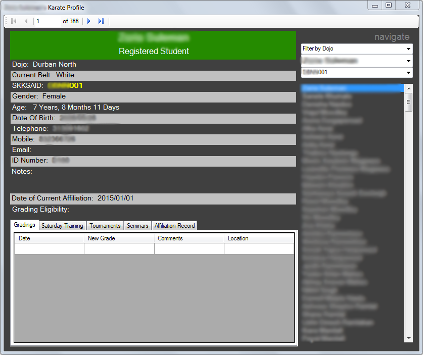 Thus arose the idea of the Student Profile. A single screen could display the selected student’s records for their tournaments, gradings, Saturday senior training attendance, seminars and affiliations. This would go along with their contact info, and data central to their karate life – i.e. their dojo affiliation, current grade and SKKSA ID (their student number).