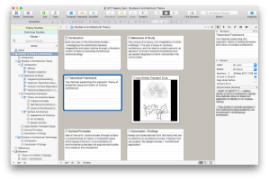 Scrivener is an app I’ve been using for years now to manage my writing projects. I still think it’s one of the best-in-class apps for managing monstrous writing tasks – of which the architectural design dissertation is such a beast. For architects (who are generally more visually-inclined), writing is indeed a step outside our comfort zones. Scrivener, then, is like a gentle friend that guides you through the treacherous waters of design research, writing, and data collation that are the three heads of the design dissertation Cerberus.